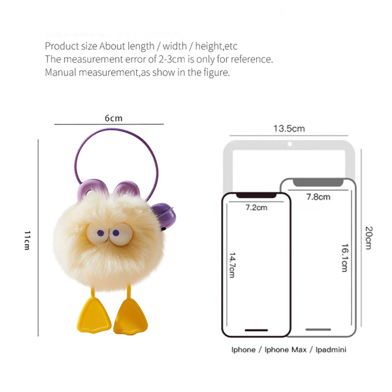 It’s shaped like a fluffy, round creature with a mischievous expression. The charm features soft, cloud-like fur that feels delightful to touch, and two bright yellow duck feet that dangle below, adding extra personality. The cute, sleepy eyes give it a unique, whimsical look that will catch attention.