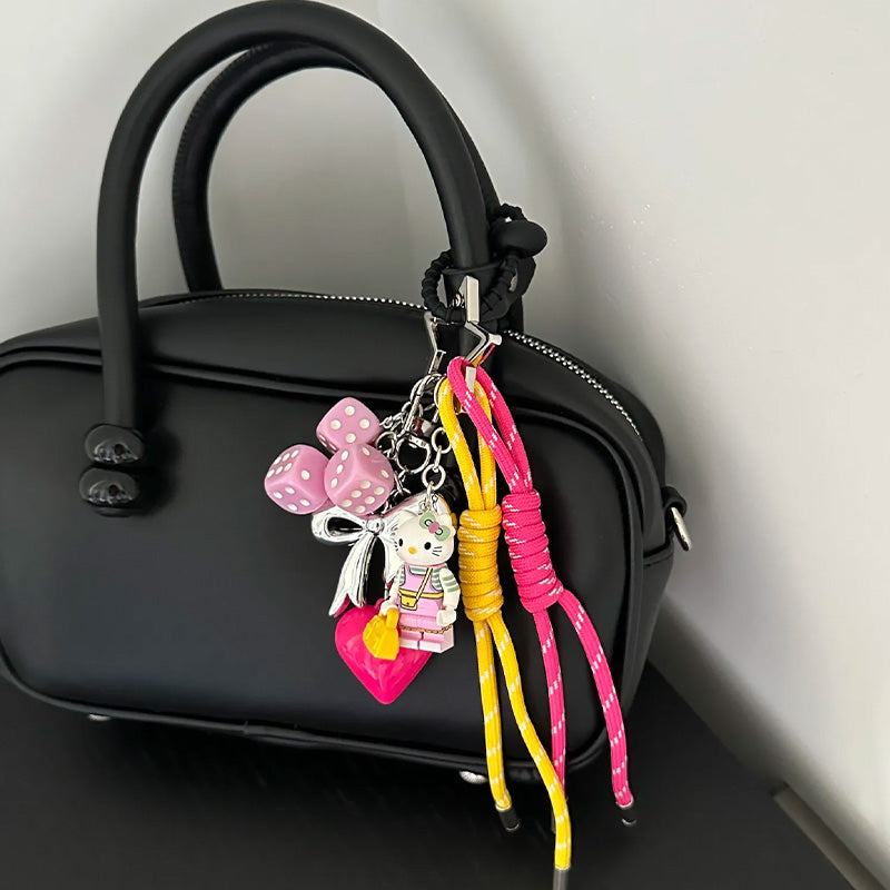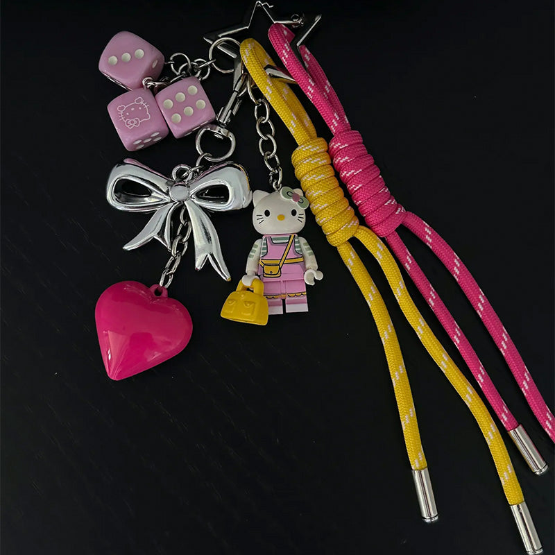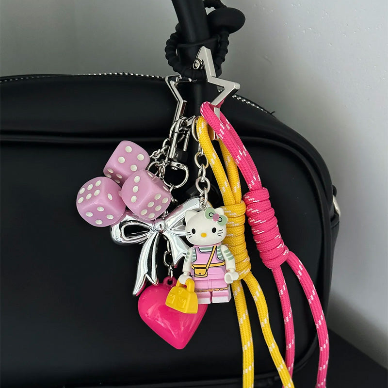 Brighten up your day with this colorful Hello Kitty bag charm! Featuring a bold mix of vibrant pink, yellow, and silver accents, this charm combines a playful Hello Kitty figure, a shiny heart pendant, cheerful dice, and colorful ropes. Turn heads wherever you go with this vivid and playful Hello Kitty bag charm.