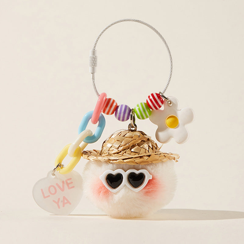 Its adorable sun hat and heart-shaped sunglasses, radiates cheerful summer vibes. The soft blush on its cheeks and the playful accessories, like the striped beads and flower detail, add a sweet and whimsical touch. The tiny "LOVE YA" charm dangling below only enhances its heartwarming personality. Whether attached to your bag, keys, or as a gift to brighten someone's day, this cute companion is sure to add a burst of joy and style to your everyday moments.