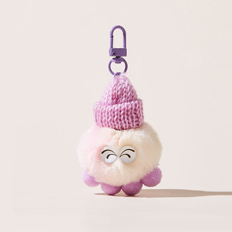 This fluffy charm, has a sweet little face with a playful expression. It wears a cozy knitted beanie in matching pink, adding a unique and stylish touch. Small feet peek out from the bottom, giving it an extra hint of charm.